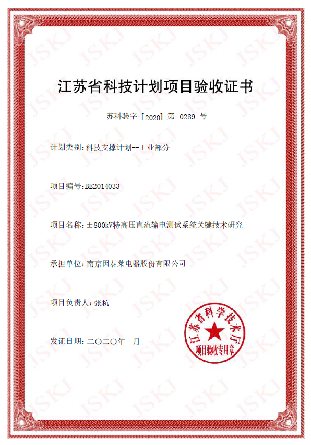 新年伊始,萬象更新!日前,南京因泰萊承擔的江蘇省科技支撐計劃項目“±800kV特高壓直流輸電測試系統關鍵技術研究”順利通過江蘇省科技計劃項目驗收并獲得證書。 2019年,…